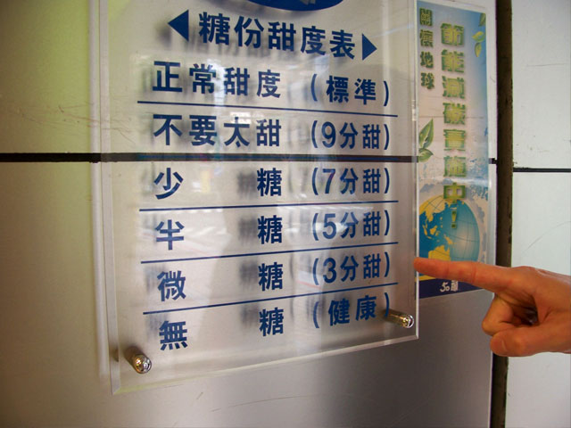 February 23, 2015 at 11:46 AMHere is a clear representation of some of the different levels of sweetness. You have "Normal amount of sweetness" 正常甜度 at the top, "I don't want it too sweet" 不要太甜, "less sweet" 少糖 "half sweetness" 半糖, "micro-sweetness"微糖 and no sugar 无糖 (healthy 健康)