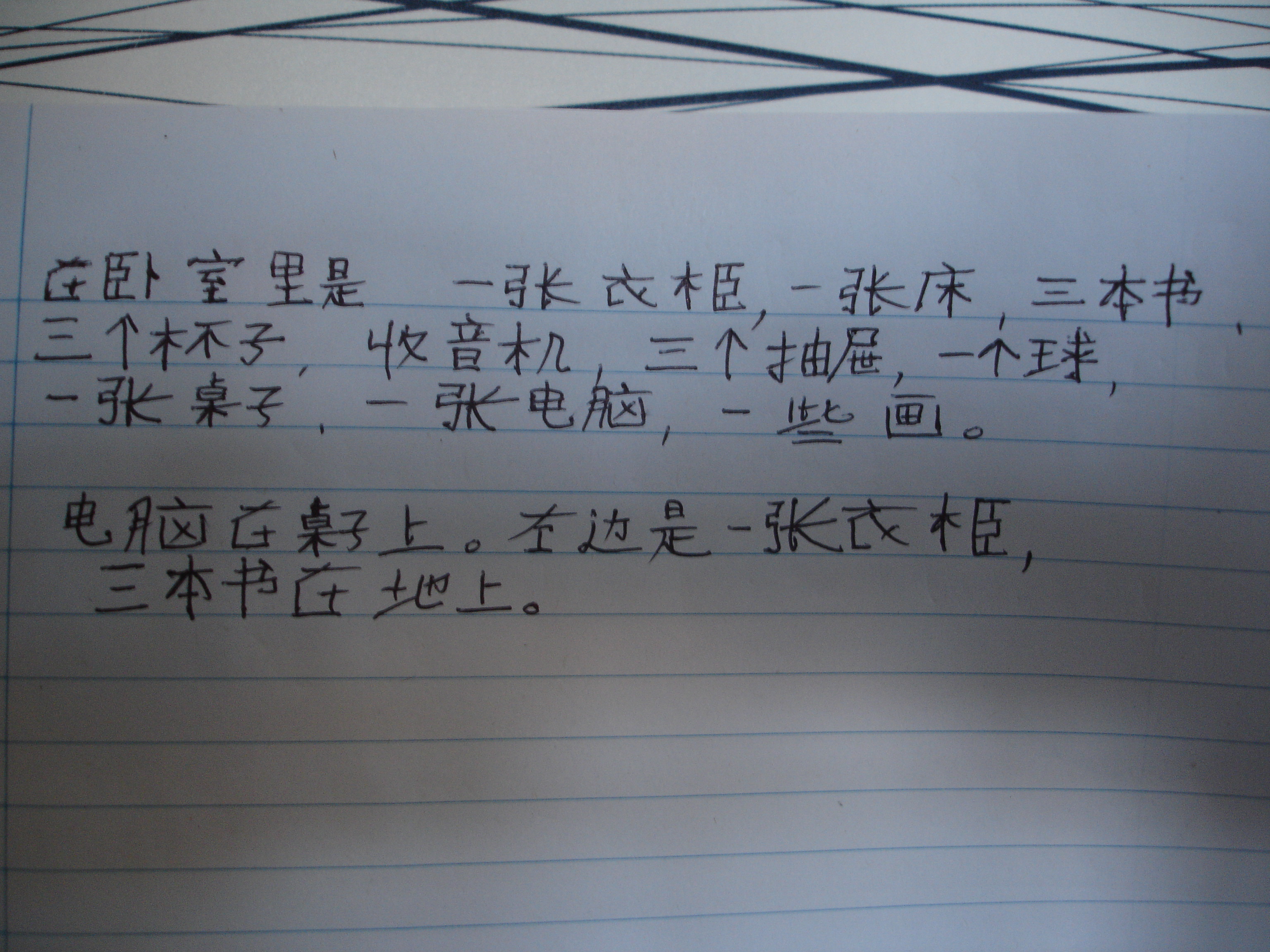 在卧室里是 一张衣柜,一张床,三本书,三个杯子,收音机,三个抽屉,一个球,一张桌子,一张电脑,一些画。