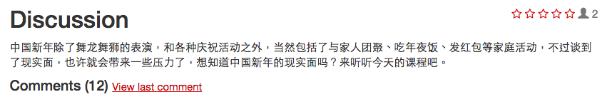 I would like to see media lessons again that are based on current events. All the cultural topics are ok, but they are not useful enough to spend more than five minutes on. I find them to be made up of a bunch of specialised vocab mixed in with elementary-intermediate sentences. I take little to nothing away from them. Also, lessons based on conversational dialogue, like the advanced lessons, are just too easy. They won't prepare students for what advanced Chinese is in the classroom and on standardised tests -- that is, long articles and complex sentences. Conversational Chinese ends at the intermediate level...