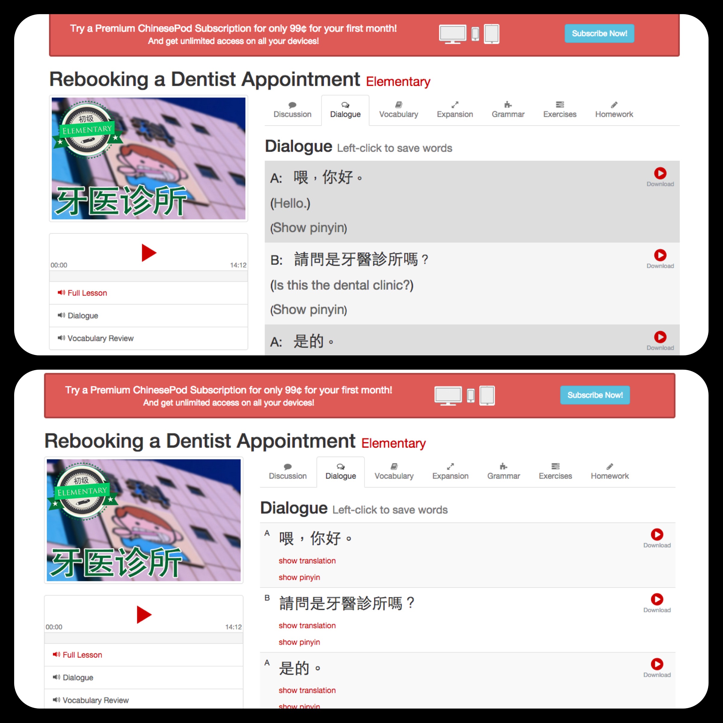 2. With their main product being the 15-20 min podcast, I don't imagine they would then write a transcript of the lesson for those who don't have the time to listen. You can look at the expansion and grammar notes to get an idea of the language focus, or just listen to ChinesePod :)