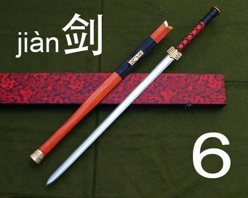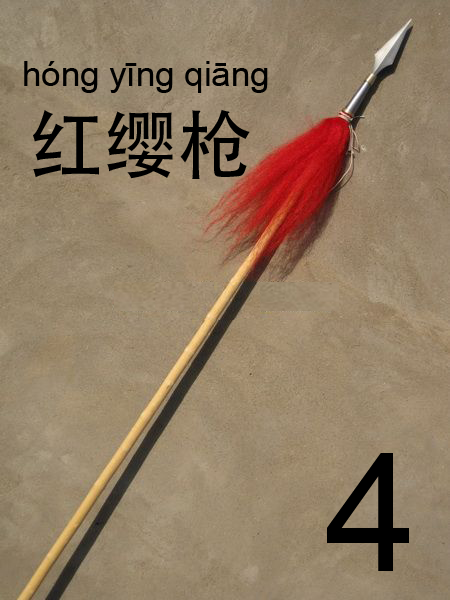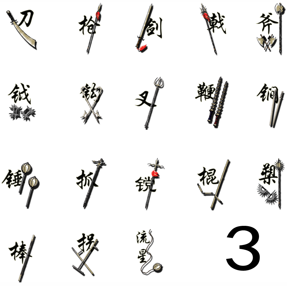 [ 刀 dāo, 枪 qiāng, 剑 jiàn, 戟 jǐ, 斧 fǔ, 钺 yuè, 钩 gōu, 叉 chā, 鞭 biān, 锏 jiǎn, 锤 chuí, 抓 zhuā, 镗 tāng, 棍 gùn, 槊 shuò, 棒 bàng, 拐 guǎi, 流星 liú xīng ]